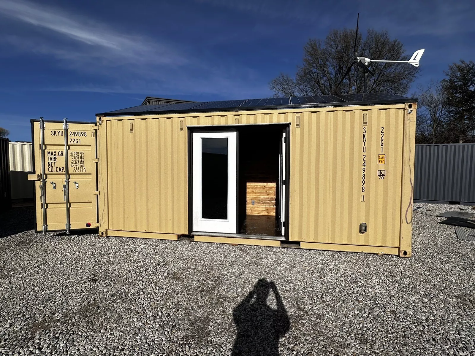 20’ shipping container office. 1900 watts of solar on the roof with a Growatt 3000 watt 120/240 inverter. This container can be run solely off batteries or you can just plug it in. Without the batteries it’s self-sufficient with the sun up if you don’t have it plugged in. The price is $18,000 without the batteries or $26,000 with. There are six 5.12 KWh EG4 lithium 48v batteries in total. It has a 9,000 BTU Senville mini split, air and heat pump, works great. The entire container and floor are closed-cell spray foamed. It’s insulated very well: it’s framed and has cedar planks for interior walls.The wind turbine will not be included unless customer is interested for $750.